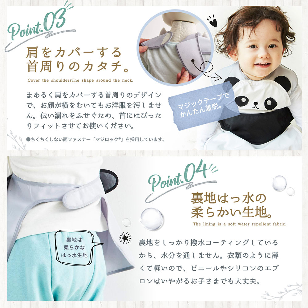 內層柔軟防潑水:裡布經防潑水處理,輕薄不悶,比厚重的 PVC/矽膠圍兜更舒適。
