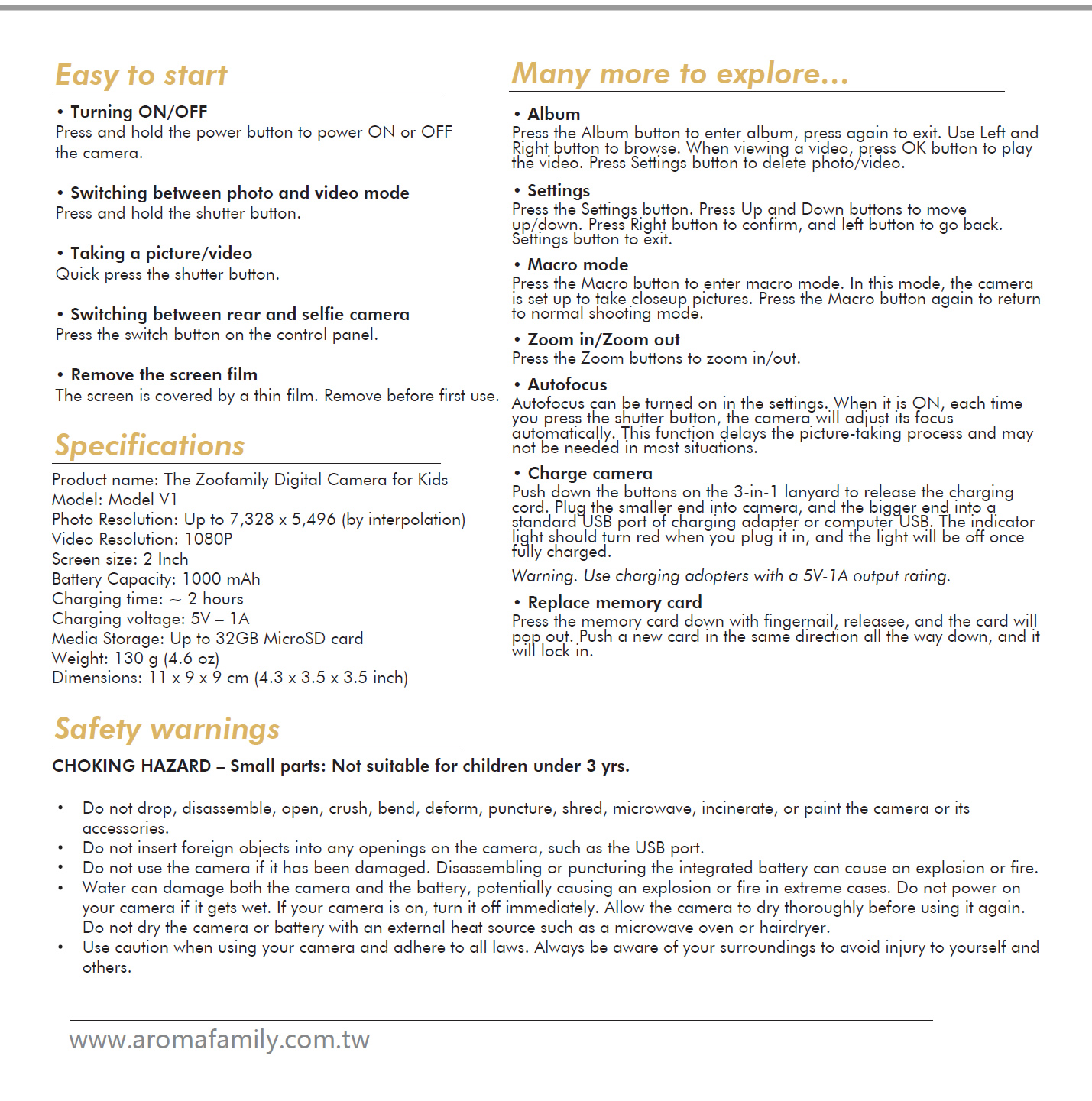 開箱即用:隨附 32GB 記憶卡(約可錄4小時或存2000張定格影像)與 2 in 1 頸掛繩+充電線。1000 mAh 可充電電池,陪孩子一路記錄冒險;介面支援多國語系,新手也能快速上手。