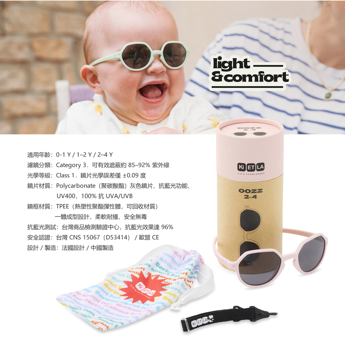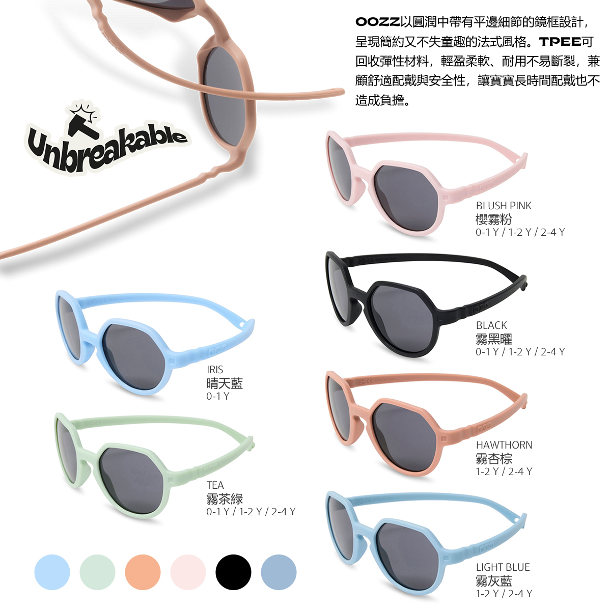 鏡片採用 Category 3 等級灰色鏡片設計,有效阻擋強烈日照並減少眩光,提供穩定清晰的視野;搭配 TPEE 可回收彈性鏡框材質,輕盈柔軟、耐用不易斷裂,即使長時間配戴也不造成負擔。從日常散步、旅行到戶外活動,OOZZ 不只是造型配件,而是一副真正兼顧視覺保護與舒適度的第一副太陽眼鏡。