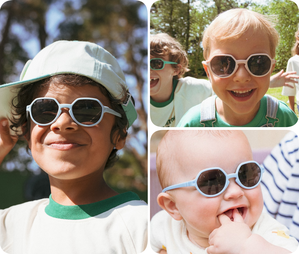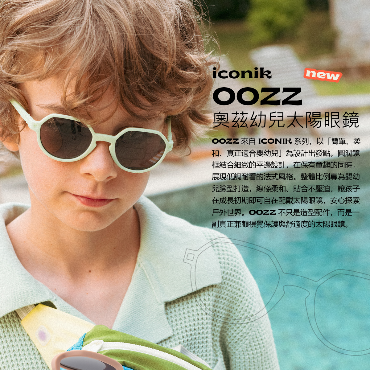 OOZZ 來自 ICONIK 系列,以「簡單、柔和、真正適合嬰幼兒」為設計出發點。圓潤鏡框結合細緻的平邊設計,在保有童趣的同時,展現低調耐看的法式風格。整體比例專為嬰幼兒臉型打造,線條柔和、貼合不壓迫,讓孩子在成長初期即可自在配戴太陽眼鏡,安心探索戶外世界。