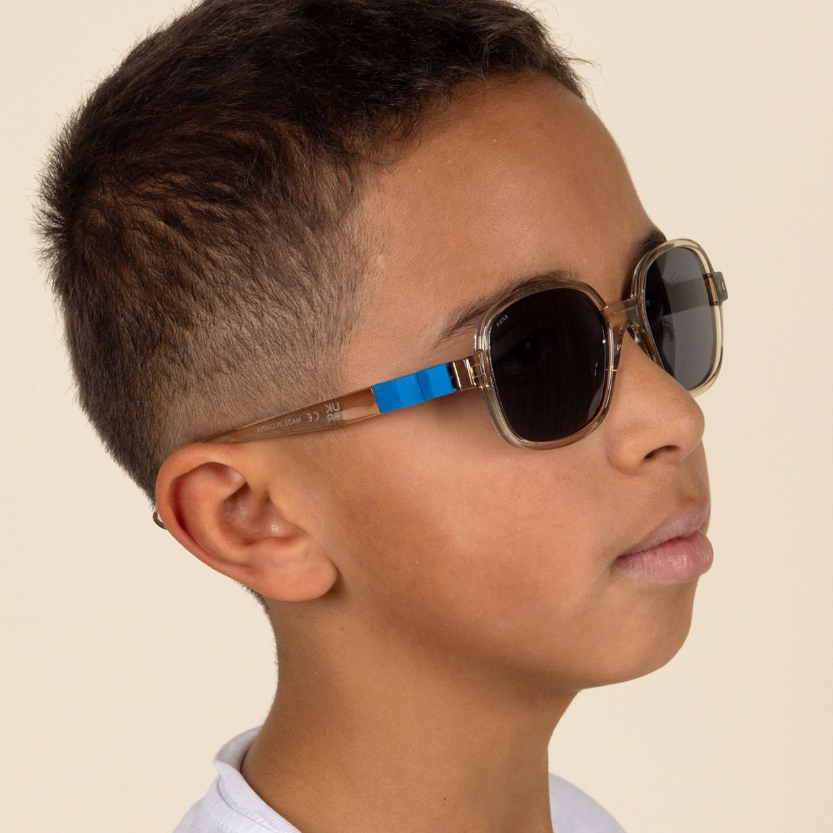 鏡腳採用 半厚實結構,搭配 180° 可彎折鉸鏈設計,在穩定支撐與舒適配戴之間取得完美平衡。霧面實色鏡腳與半透明鏡框材質形成細緻對比,視覺上更顯輕盈,同時提升整體質感層次。鏡片為 第 3 類灰色偏光鏡片,有效降低眩光、提升視野清晰度,在強烈陽光下也能給予孩子穩定且舒適的視覺體驗。無論是城市探索、戶外活動或假期旅行,URBAN 都是一副兼顧造型與防護的理想選擇。