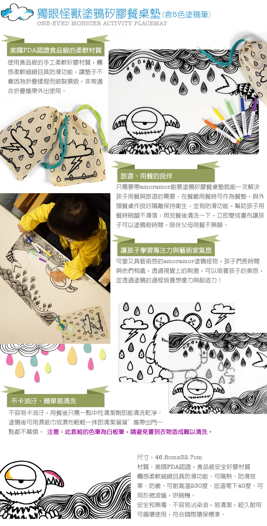 澳洲amoramor 獨眼怪獸塗鴉矽膠餐桌墊套件組(含5色塗鴉筆)