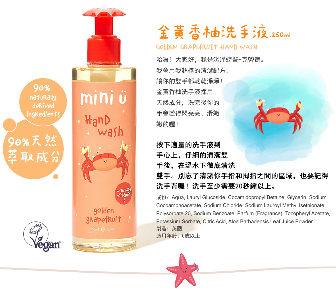 我會用我超棒的清潔配方,讓你的雙手都乾乾淨淨!金黃香柚洗手液採用天然成分,洗完後你的手會變得閃亮亮、滑嫩嫩的喔!