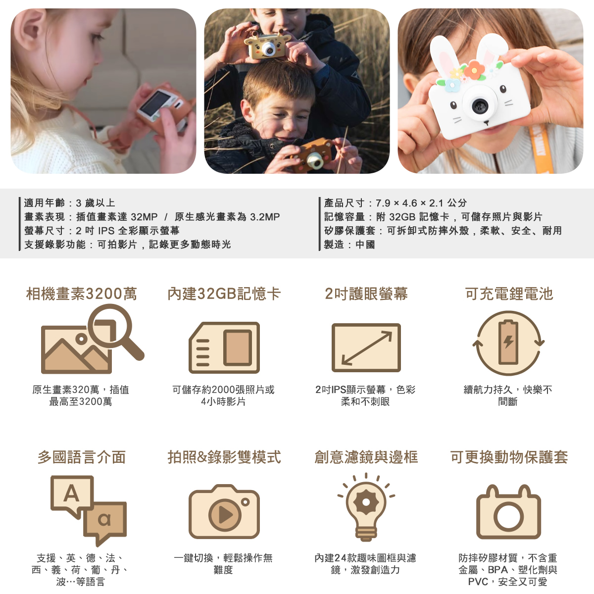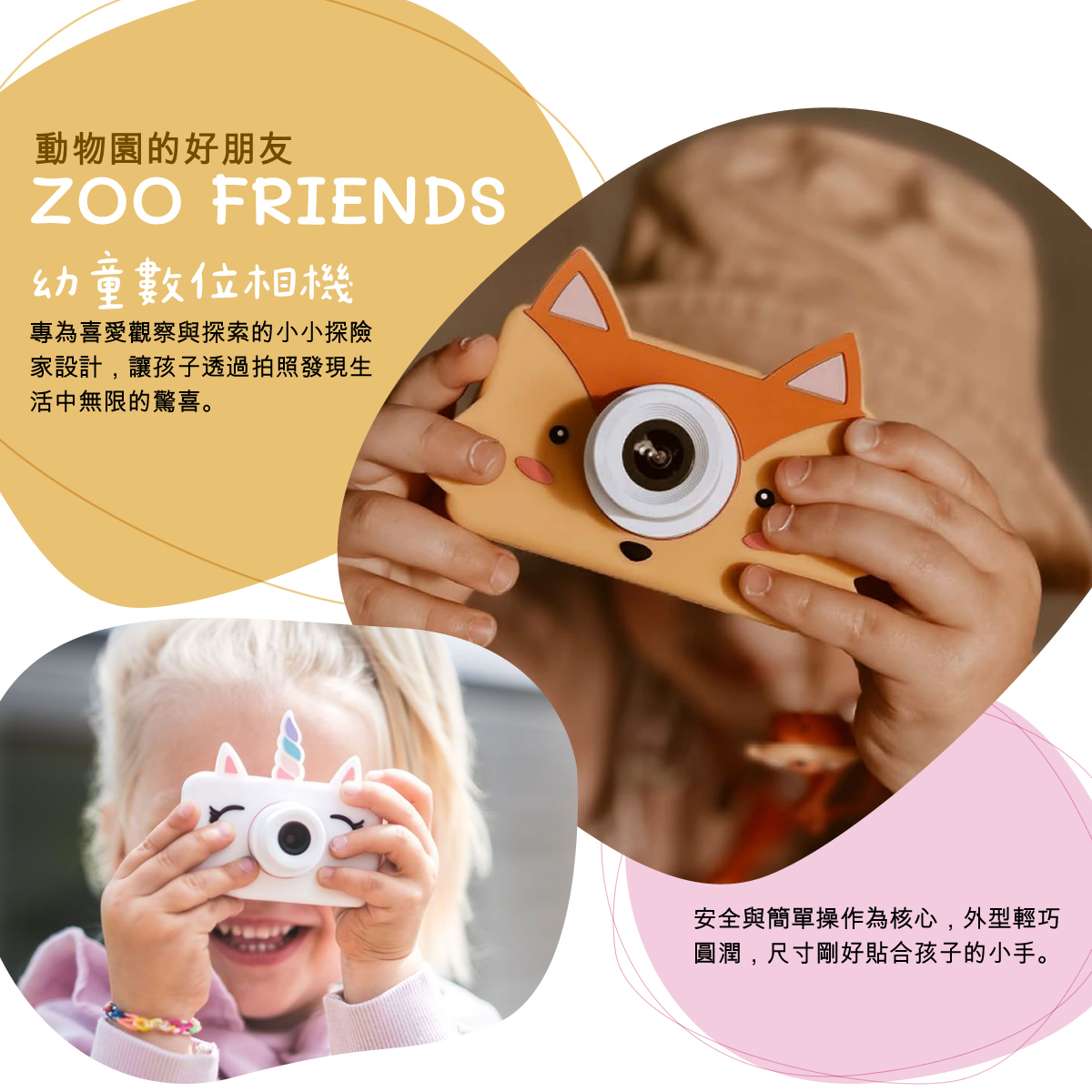 Zoo Friends幼童數位相機以安全與簡單操作為出發點,外型輕巧圓潤、尺寸剛好貼合孩子小手,幫助孩子用自己的眼睛探索世界、記錄童年。每台相機皆搭配可更換的矽膠動物造型保護套,既防摔又可愛,讓拍照彷彿展開一場趣味十足的「動物園探險」!
